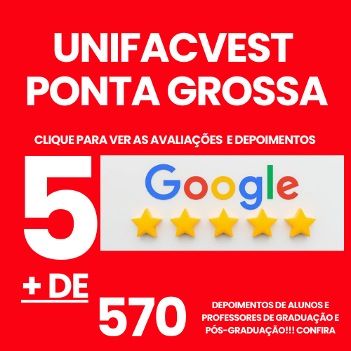 A Unifacvest Ponta Grossa é um polo da matriz de Lages, SC, e está distribuída em mais de 1000 cidades no Brasil. Localizada na rua Quinze de Novembro, 405 - Centro de Ponta Grossa, tem por missão formar profissionais competentes e éticos, oferecendo um ensino de alta qualidade. São mais de 570 depoimentos no Google (CLIQUE NA IMAGEM AO LADO) e somos 5 estrelas devido a nossa metodologia e suporte aos nossos acadêmicos. Confira.